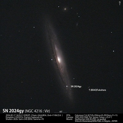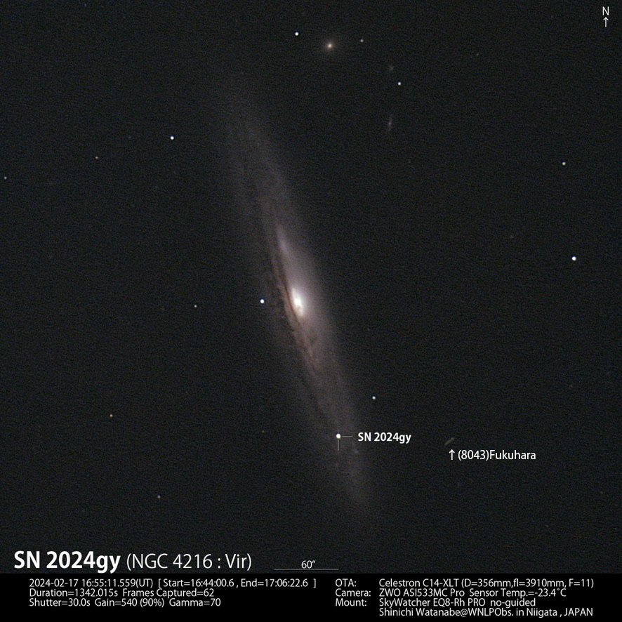 ![]() NGC 4216銀河に出現した超新星2024gyのそばを通過中(渡辺真一さん撮影) ※画像クリックで拡大 →フル画像 |